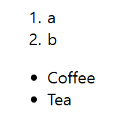 <li>b</li> <!-- <li>는 부모 tag인 <ol> 또는 <ul>가 있어야 합니다.-->