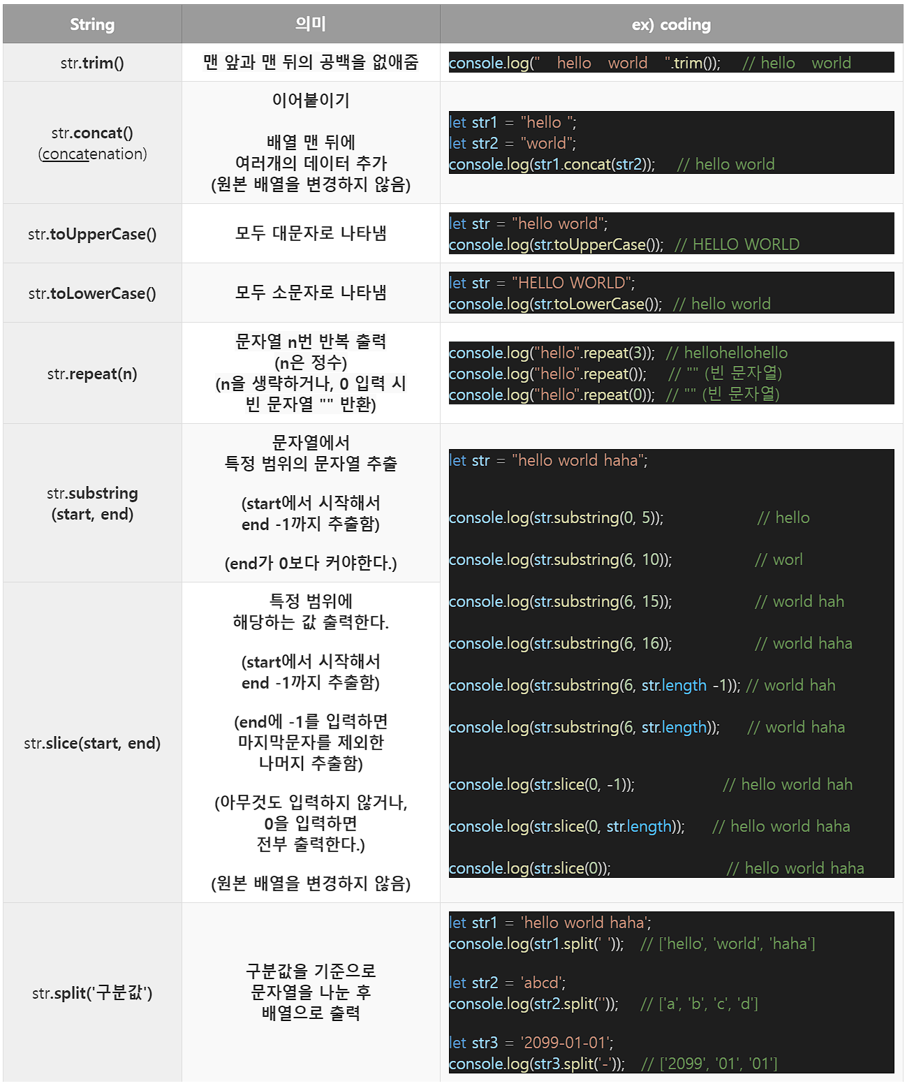 console.log(str[0]); // "h" (첫 번째 문자의 인덱스가 0 이라는 점을 주의해 주세요.)