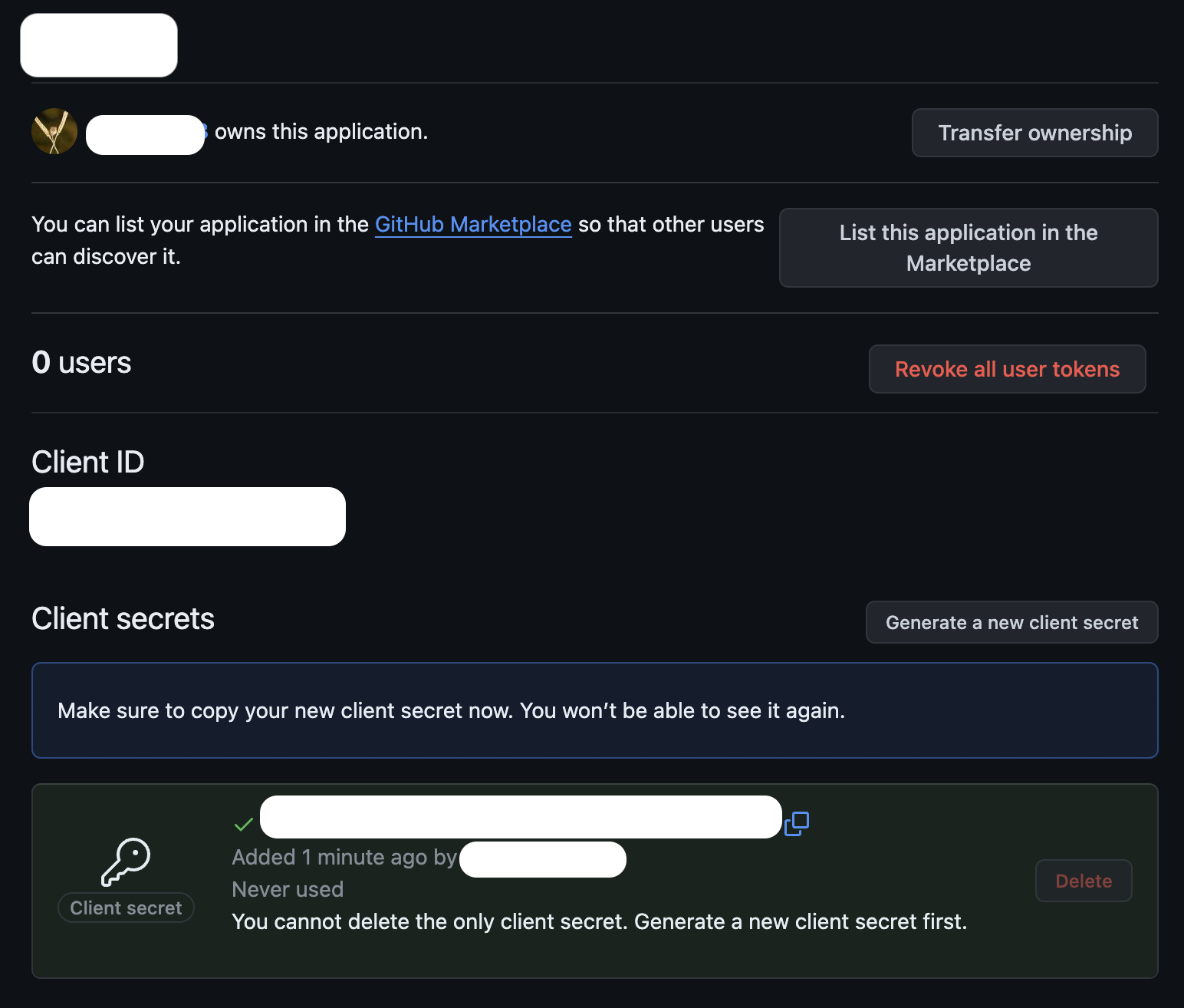 Generate a new client secret 버튼을 눌려서 토큰을 발급받습니다.